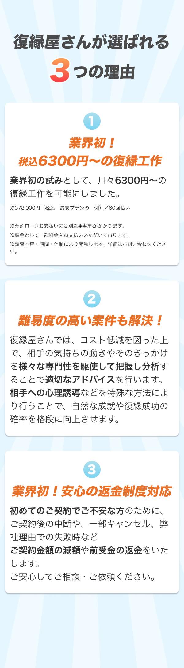 - はい、返金制度がございます。契約時のクーリングオフ対応や契約途中での契約解約の際など、返金要件がございます。詳細については、契約前や契約後にかかわらず、無料相談窓口や復縁担当者までお気軽にご相談ください。